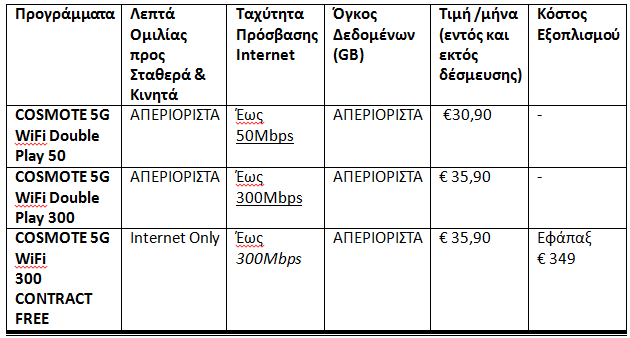 NewsΤηλεπικοινωνίες [ΔΤ]: Διαθέσιμα τα νέα προγράμματα COSMOTE 5G WiFi Double Play By i.tsompas 27 Ιουλίου, 2025596 views ShareTweet 0 Η ΟΤΕ ΑΕ ανακοινώνει ότι από την 24 Ιουλίου 2025: Παύει η εμπορική διάθεση των προγραμμάτων COSMOTE 5G WiFi 50 και COSMOTE 5G WiFi 300 Το υφιστάμενο πρόγραμμα COSMOTE 5G WiFi 300 Contract Free (χωρίς δέσμευση) παραμένει διαθέσιμο χωρίς αλλαγές και παρέχεται αποκλειστικά για χρήση Internet (internet only), χωρίς δυνατότητα φωνής. Διατίθενται εμπορικά τα νέα προγράμματα COSMOTE 5G WiFi DOUBLE PLAY 50 και COSMOTE 5G WiFi DOUBLE PLAY 300 τα οποία παρέχουν και απεριόριστα λεπτά ομιλίας προς όλα τα εθνικά δίκτυα. Τα νέα προγράμματα ενσωματώνουν υπηρεσία φωνής, προσφέροντας μια ολοκληρωμένη εμπειρία επικοινωνίας. Τα βασικά χαρακτηριστικά και οι χρεώσεις των νέων Οικονομικών Προγραμμάτων παρουσιάζονται αναλυτικά στον πίνακα που ακολουθεί. Στα παραπάνω ποσά συμπεριλαμβάνεται ΦΠΑ 24% & Τέλη Κινητής Τηλεφωνίας. Τα δωρεάν λεπτά ομιλίας αφορούν μόνο σε κλήσεις προς όλα τα εθνικά δίκτυα σταθερής και κινητής τηλεφωνίας (γεωγραφικούς αριθμούς και αριθμούς κινητής τηλεφωνίας), εξαιρουμένων των κλήσεων προς μη γεωγραφικούς αριθμούς (εκτός των αριθμών κινητής τηλεφωνίας). Επιπλέον, Τα προγράμματα COSMOTE 5G WiFi DOUBLE PLAY 50 και COSMOTE 5G WiFi DOUBLE PLAY 300 παρέχονται με 24μηνη δέσμευση, ενώ το υφιστάμενο πρόγραμμα COSMOTE 5G WiFi CONTRACT FREE προσφέρεται χωρίς χρονική δέσμευση. Η σύνδεση λειτουργεί αποκλειστικά στη δηλωθείσα διεύθυνση εγκατάστασης. Εφόσον η εγκατάσταση πραγματοποιείται από τεχνικό του ΟΤΕ, ισχύει χρέωση σύμφωνα με την εμπορική πολιτική της υπηρεσίας COSMOTE Home Connect. Εξοπλισμός: Για τα προγράμματα με δέσμευση, ο απαιτούμενος εξοπλισμός παρέχεται με χρησιδάνειο. o Για outdoor εξοπλισμό που αποτελείται από δύο συσκευές, εξωτερική και εσωτερική: Ποινή μη επιστροφής/φθοράς για «5G WiFi OUTDOOR Router»: 299,00€ με ΦΠΑ Ποινή μη επιστροφής/φθοράς «ZTE T5400+ WIRELESS ROUTER»: 59,00€ με ΦΠΑ o Για indoor εξοπλισμό Ποινή μη επιστροφής/φθοράς. Ποινή μη επιστροφής/φθοράς για «5G WiFi INDOOR Router»: 249,00€ με ΦΠΑ Συνδυαστικές Παροχές: Όλα τα προγράμματα μπορούν να ενσωματωθούν σε σχήματα MagentaONE και να συνδυαστούν με COSMOTE TV, προσφέροντας πρόσθετα προνόμια στους πελάτες. Για περισσότερες πληροφορίες επισκεφθείτε το [osmote.gr,καλέστε στο 13888 ή απευθυνθείτε στο Δίκτυο Καταστημάτων COSMOTE & ΓΕΡΜΑΝΟΣ. Δημιουργήστε ένα λογαριασμό ή συνδεθείτε για να σχολιάσετε Συνδεθείτε για να σχολιάσετε Καλώς ήλθατε {{inv_username}} comments Συνδεθείτε για να απαντήσετε Aπαντήστε {{inv_error}} New Comment Post Comment Logout Σύνδεση Email Κωδικός Σύνδεση Κλείσιμο