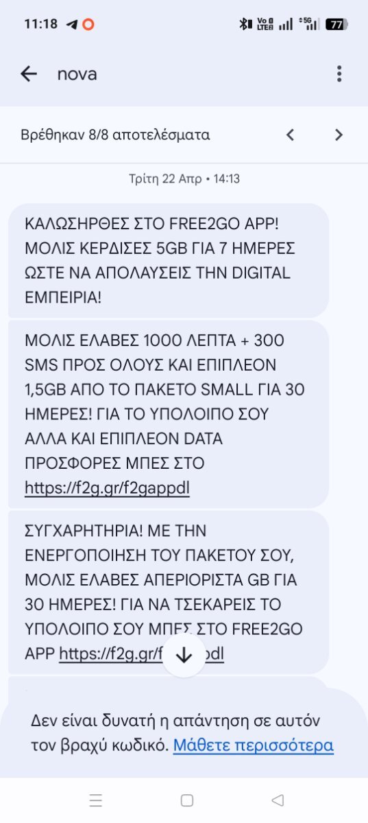 sou_d Δημ. 24 Ιανουαρίου Κοινοποίηση Δημ. 24 Ιανουαρίου (edited) Σε λίγες μέρες κλείνω και εγώ 1 χρόνο με το f2go. Προσωπικά πήγα για την προσφορά του lidl με τα έξτρα 24gb, με κάθε ανανέωση άνω των 13€, για 2 χρόνια. Ωστόσο, στάθηκα τυχερός και μου έδωσαν από μόνοι τους την προσφορά με τα απεριόριστα για 12 μήνες. Θα ενημερώσω αν έρθει και σε εμένα αντίστοιχο μήνυμα λήξης Επίσης χτες ήρθε μία extra sim, από πακέτο απεριόριστων που παρήγγειλα ως δώρο, με αυτές τις παροχές. Τίμιο Edited 24 Ιανουαρίου by sou_d 3 1 Παράθεση Link to comment Share on other sites Περισσότερες Επιλογές Κοινής Χρήσης