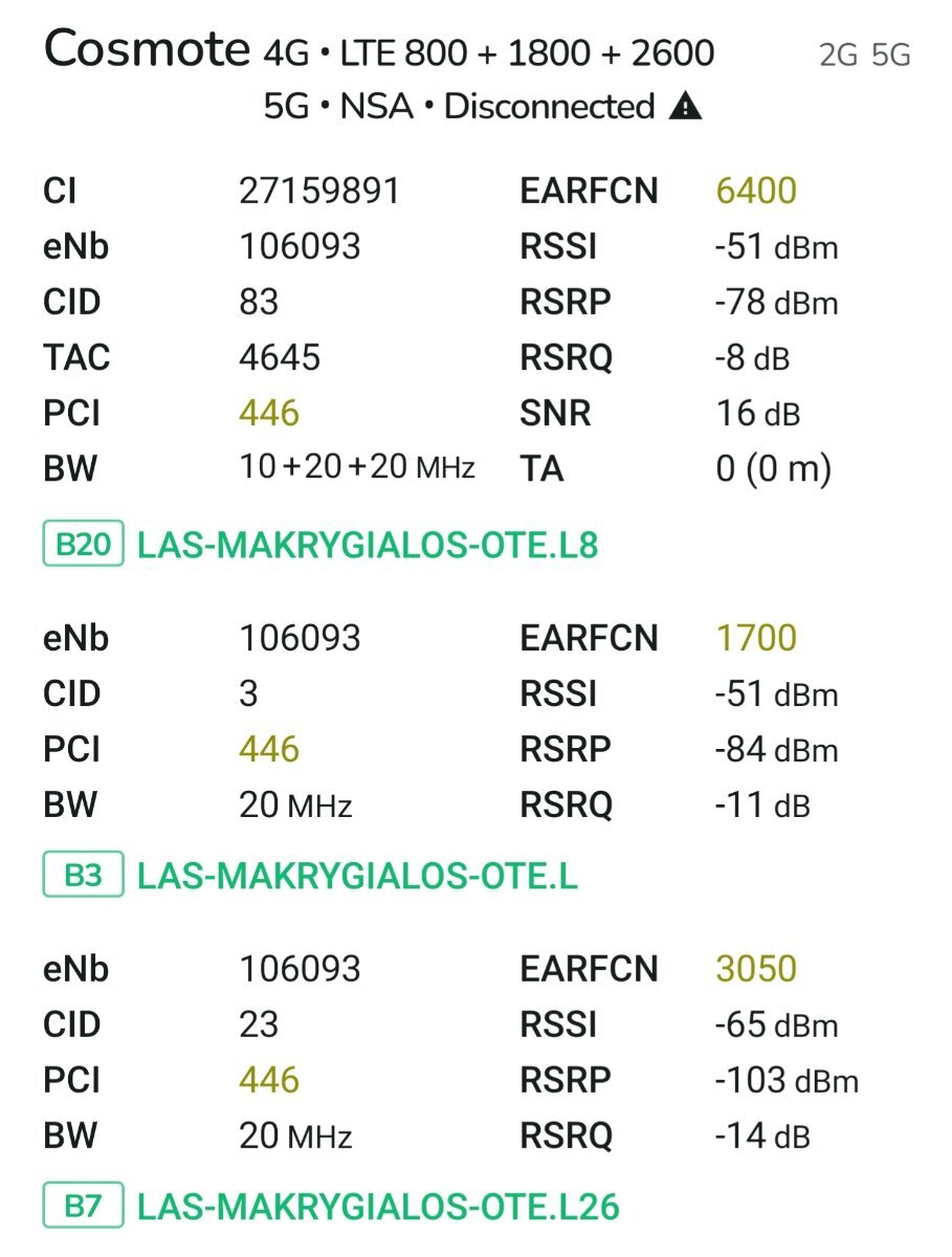 manzoump Δημ. Δευτέρα στις 09:19 μμ Κοινοποίηση Δημ. Δευτέρα στις 09:19 μμ (edited) Το router είχε μείνει σε mode για εξωτερικές κεραίες που εδώ και καιρό δεν τις έχω πάνω αλλά δεν το είχα αλλάξει. Γύρισε σε inner, είναι δίπλα σε παράθυρο με οπτική επαφή στον σταθμό, έκοψα τη B20 και άφησα B1 B3 B7. Μάλλον έχουν κόψει εντελώς τη B1 σε 4G και την δίνουν για 5G NSA μόνο; Όταν έχω B1 only, δεν συνδέεται καν το router. Edited Δευτέρα στις 09:20 μμ by manzoump 7 Παράθεση OnePlus 13 - COSMOTE Gigamax Unlimited Link to comment Share on other sites Περισσότερες Επιλογές Κοινής Χρήσης